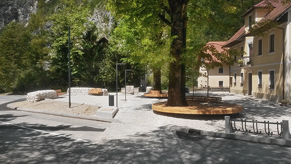 Obstoječi trg »NA LOGU« se preuredi v osrednji vaški trg, ki postane prostor za druženje, organizacijo manjših kulturnih prireditev, tržnice ali sejma. Trg vsebuje informacijski blok za obiskovalce, element vode, ki ga tvori iz neposredne bližine prinešen kamniti pitnik, klopi in obstoječa drevesa. Oblikovanje trga in njegova materializacija se navezujeta na obstoječe strukture v prostoru – predvsem na trg pred trentarskim muzejem. Glavnino tržne površine prekriva zbit pesek, deloma pa tlak iz avtohtonega kamna. Zunanji zatravljeni obod trga na delih zaključujejo utrjeni dostopi in tako imenovani »miri in kašte«, ki predstavljajo sodobno interpretacijo suhega zidu, ter tako poudarjajo in zaključujejo naravni ambient doline Trente.