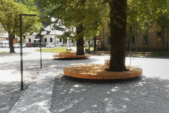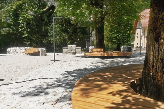 Trg “NA LOGU” se uredi v osrednji vaški trg, kjer bo možno posedanje ter organizacija manjših dogodkov