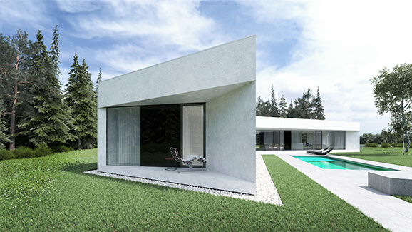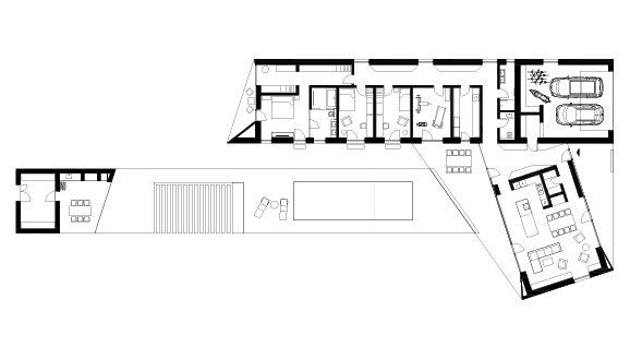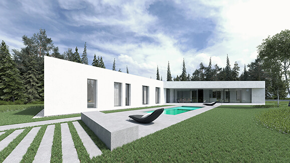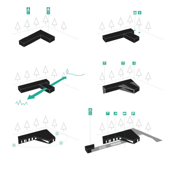 Pritlični, individualni, prosto stoječ stanovanjski objekt je členjen na dva sklopa: severni (servisna, mirna in privatna cona objekta) in južni (dnevna, bivalna in javna cona objekta). S pozicioniranjem hiše na severovzhodnem kotu parcele, ter z nastavljanjem ustreznih odmikov od severne in vzhodne parcelne meje (robovi gozda z visokimi iglovci) se ustvarja predpogoj, da je omogočena vizura tako v dolino proti vzhodu, kot tudi na Pohorje proti zahodu. Dva sklopa sta postavljena med sabo pot kotom 125°, in zarisujeta zunanji atrijski prostor. Ta atrijski prostor, intimen in skrit pred pogledi, predstavlja osrednji del bivanja družine v spomladanskih in poletnih mesecih z osrednjim elementom - bazenom. V nadaljevanju tega atrijskega prostora proti severozahodu je pozicioniran pomožni objekt.
