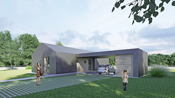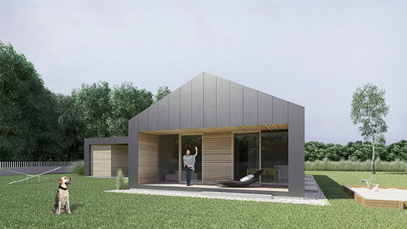 Tipska enodružinska hiša J je predvidena kot pritlični prosto stoječi objekt, sestavljen iz osnovnega stanovanjskega kubusa na katerega se navezuje aneks objekta (nadstrešek za dve osebni vozili, z integrirano shrambo ter nadkrit vhod v objekt). Tipski objekt s svojo sodobno interpretacijo klasične dvokapnice in minimalističnim oblikovanjem je primeren tako za ozke parcele v mestnih urbanih conah, kot tudi za večje parcele v podeželjskih ali suburbanih sredinah. Hiša je maksimalno racionalno zasnovana. V 105 m2 je kompaktno razporejen velik dnevni prostor s kuhinjo in jedilnico, spalnica, dve sobi, kopalnica, ločen dnevni WC in prostor za tehniko. Skozi transparentno fronto na čelu se osrednji prostor hiše kakovostno povezuje z zunanjim prostorom in briše meje med notranjostjo in zunanjostjo.