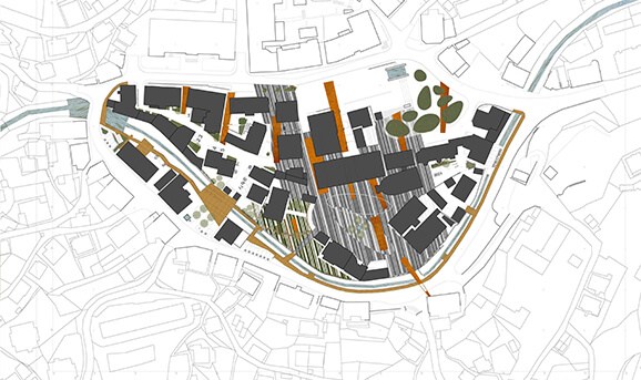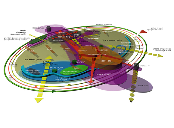 Spoznavanje identitete prostora skozi proces urbane disperzije, ponovno sestavljanje in vnovično branje, ter študija urbanistične matrice. Glavna tema naloge je nadgraditev in transformacija prostora, skozi dialog starega in novega, v kontekstu časa in lokacije posameznih vsebin. Kot rezultat analize obstoječega stanja in osvojenega koncepta se predlagana rešitev naslanja na tri glavne prostorske ukrepe, za ohranitev identitete prostora. Stari trg Sv. Ahacija je postavljen kot osrednji del ureditvene situacije in predstavlja programsko zgoščen element ureditve. Sprehajalna pot ob vodotoku Nikova je opredeljena kot linijska in mejna poteza ureditve. Urbana oprema je definirana kot vezni element in povezovalec posameznih vsebin.