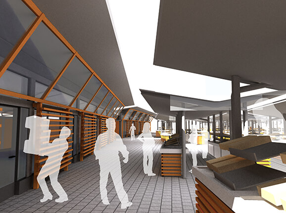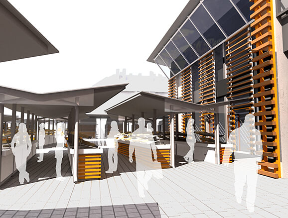 Zasnova zelene tržnice sestavljene iz odprtega in zaprtega dela ter dizajn stojnic in kioskov