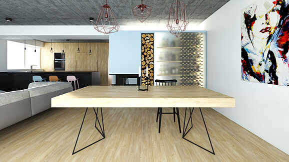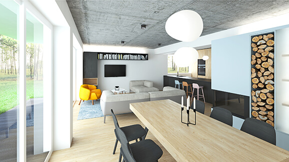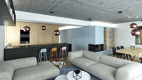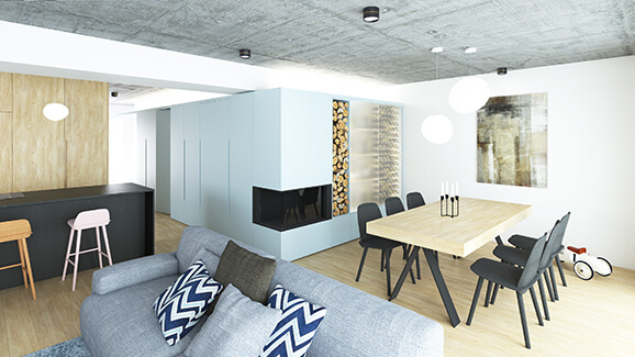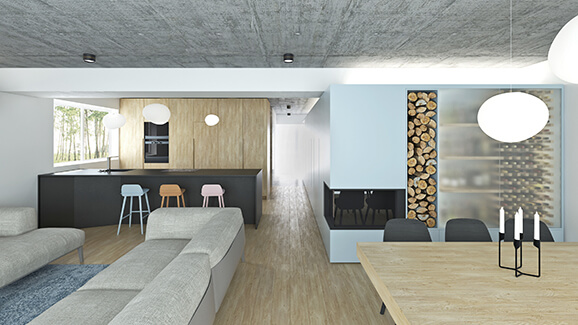 Pri danem projektu gre za oblikovanje interierja stanovanjskega dvojčka v tretji podaljšani gradbeni fazi. Želja investitorjev je bila čimbolj odprta zasnova, ki bi omogočala, da počitek, delo, druženje, kuhanje in prehranjevanje poteka v enem velikem dnevnem prostoru. Velik prostor, ki združuje kuhinjo, dnevno sobo in jedilnico, smo lahko vzpostavili le z rušitvijo obstoječe nosilne stene, ki je prej razmejevala prostor in postavitvijo jeklene preklade. Pri oblikovanju interierja so upoštevane sodobne smernice oblikovanja. Uporabljene so 4 osnovne materializacije: krtačen hrast iz katerega je izdelan parket in kuhinjski niz do vrha, vidni beton na obstoječem stropu, svetlo-modra barva v kateri je kubus s kaminom, sedalom, vitrino in omarami ter temna barva v kateri je kuhinjski otok. Glavni element v prostoru, okoli katerega se ustvari interier je svetlo-moder kubus s kaminom, sedalom, vitrino, omarami ter vrati v Wc in shrambo, ki smiselno združuje funkcionalne elemente v zaključeno enoto. Osrednji prostor se skozi veliko zasteklitev odpira na dvorišče.